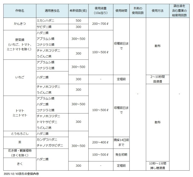 野菜類、イチゴ、トマト・ミニトマトのコナジラミ類が300~500倍に変更されました。