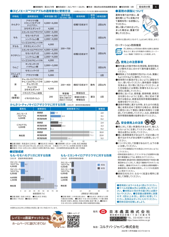 有効成分のスピノサドは、有機JAS規格の基準に合致する資材(別表2の農薬)に記載 されていますので、有機農産物に使用する事ができます。また、特別栽培農産物の使 用回数にカウントされない農薬としても認められています。適用病害と使用方法